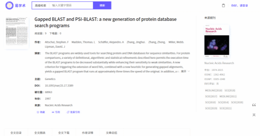 EA学术资源库涵盖了13万种外文期刊、1.6亿条外文文献数据、26亿条引文数据,提供6300万篇全文下载。全面覆盖科技、医学、农业、交通、航空航天、社会科学、艺术与人文科学等全球研究成果。资源库使用大数据分析和人工智能(AI)技术,将散落于互联网中的外文文献信息进行汇聚整合,并对海量文献数据进行深度挖掘、精准提炼、关联分析和精细加工后形成了高质量外文文献数据库和自有引文网络数据库。该数据库利用人工智能分析引擎对高引用文章和经典文献进行文献总结,从而更好地辅助读者对学术文献的理解和利用,极大提升科研效率。